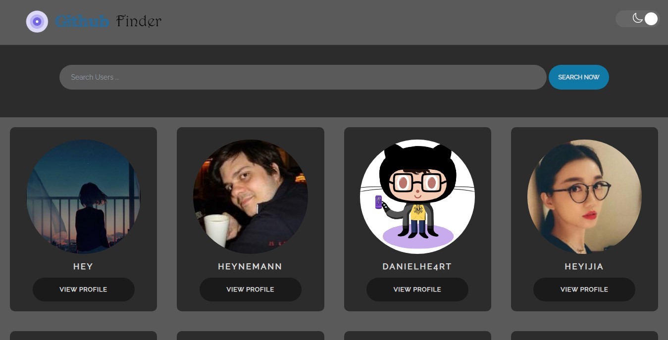 Github Finder is a web-based app. It interacts with Github developer Api to fetch users and their data.